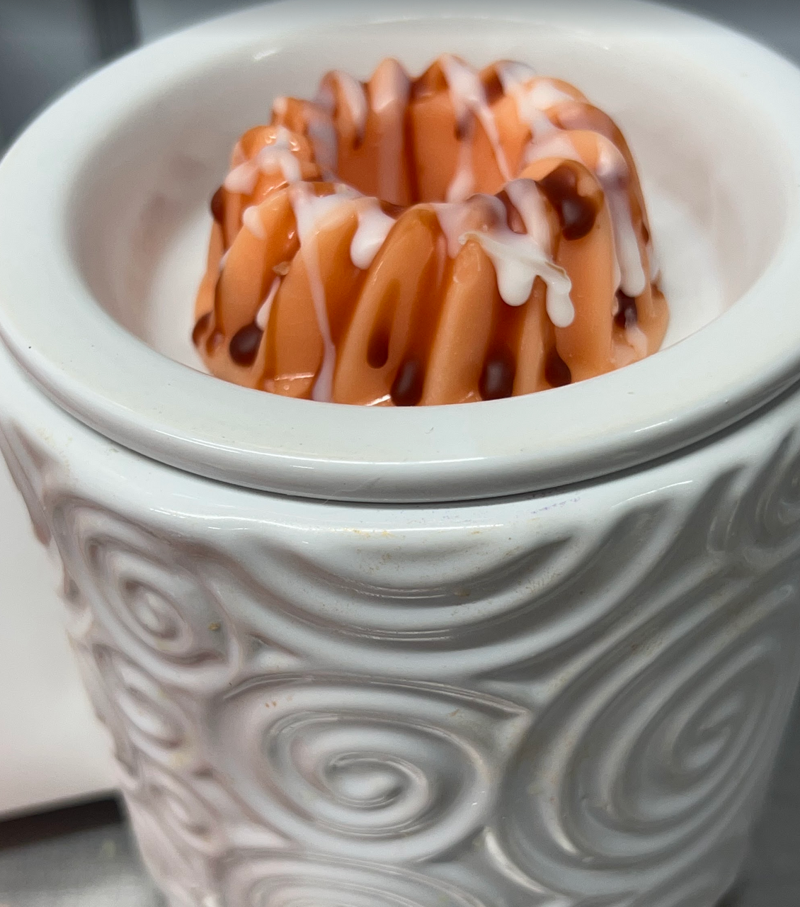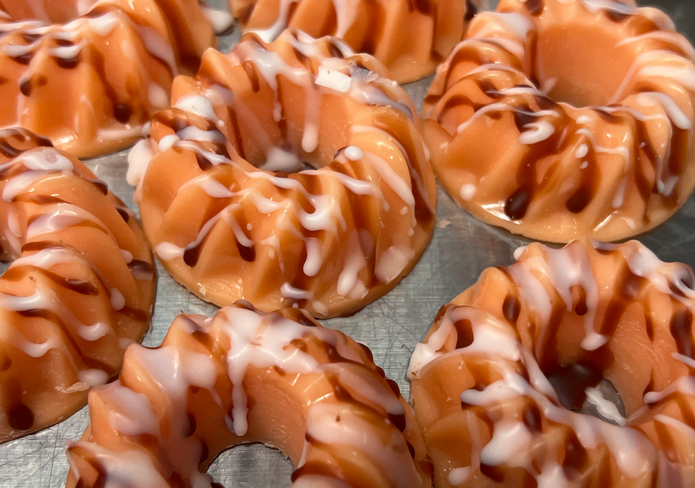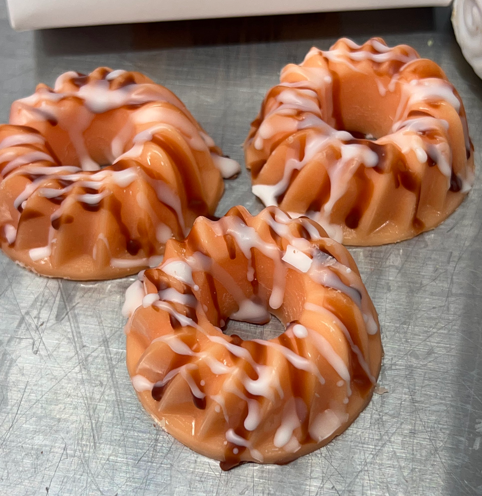 These wax melts look just like little mini bundt cakes! They are scented in a delicious chocolate orange cream cake fragrance. They are orange with brown & white drizzled icing.