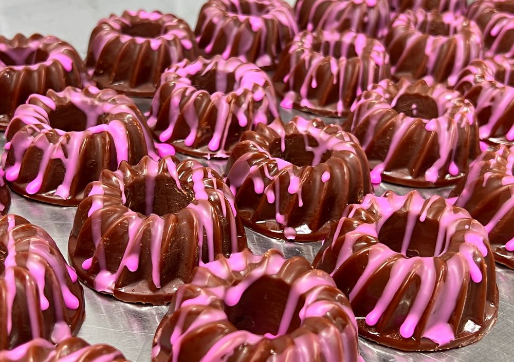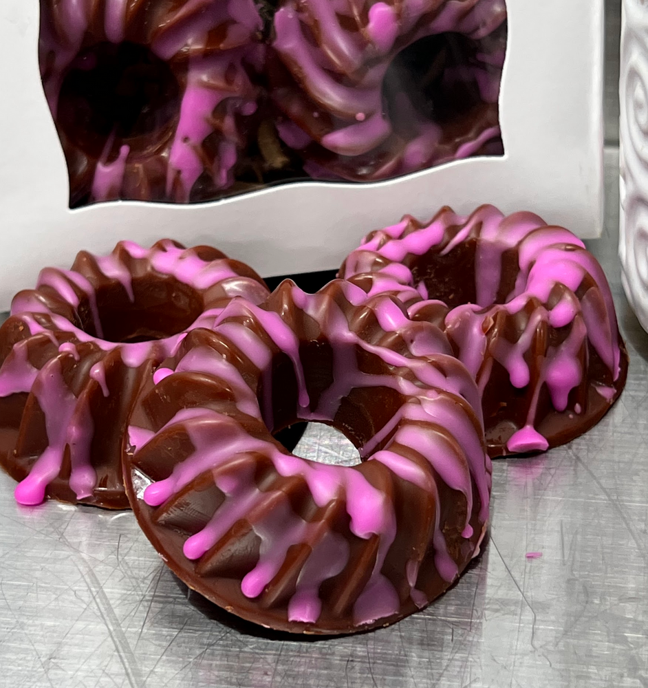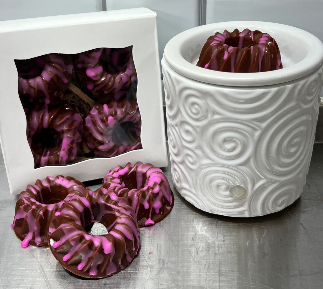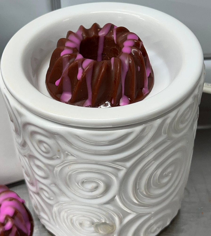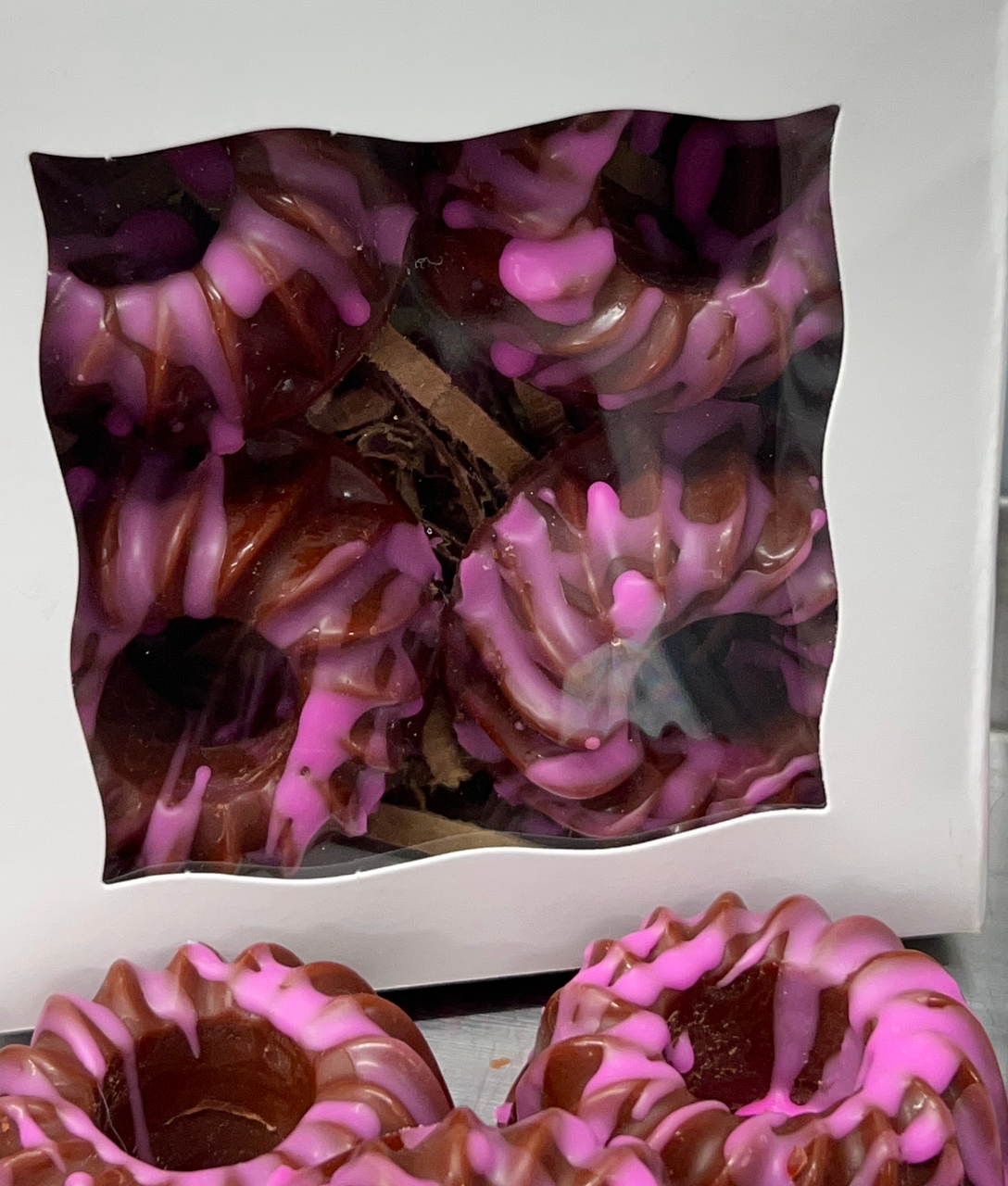 They are scented in a delicious chocolate raspberry fragrance. They are brown with pink drizzled frosting. These are all hand poured in small batches, so colors may vary slightly from batch to batch.