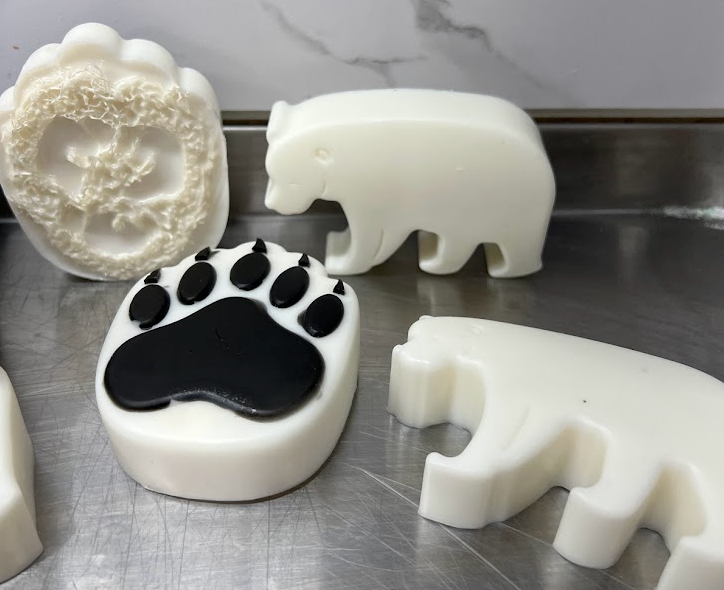 This is a 2-bar polar bear & paw soap gift set! You will receive the gift set of 2 bars of soap. There is a polar bear and a polar bear paw. These are scented in a winter garden scent (top notes of fresh lime, menthol, middle notes of douglas fir and lavender, and base notes of eucalyptus and pine)!